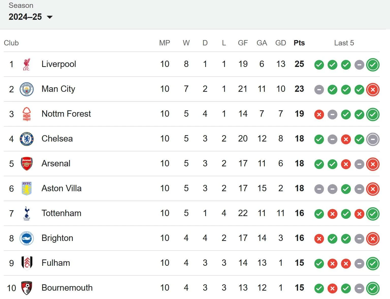 The verdict is that the Premier league is wide open and the margins so fine, that predicting who will top the table in May is like gambling on the horses at Ascot. Who would have guessed that Nottingham Forest would sit at third in the table after 10 games, given that they were almost relegated during 2023/24? (see table below)